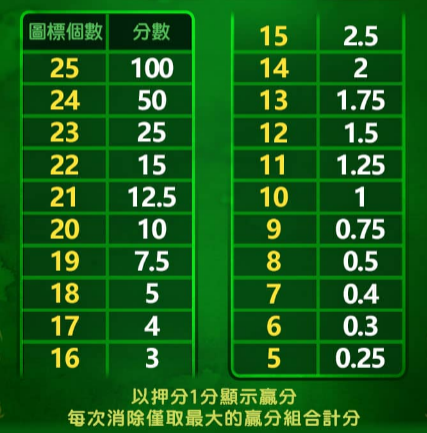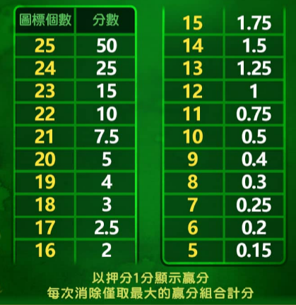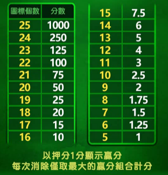 遊戲採用 5×5 盤面設計,只要 5 個以上相同符號相連,就能形成得分並消除。消除後會補上新的符號,如果再次形成組合,就會持續連線,讓畫面自然延續下去。